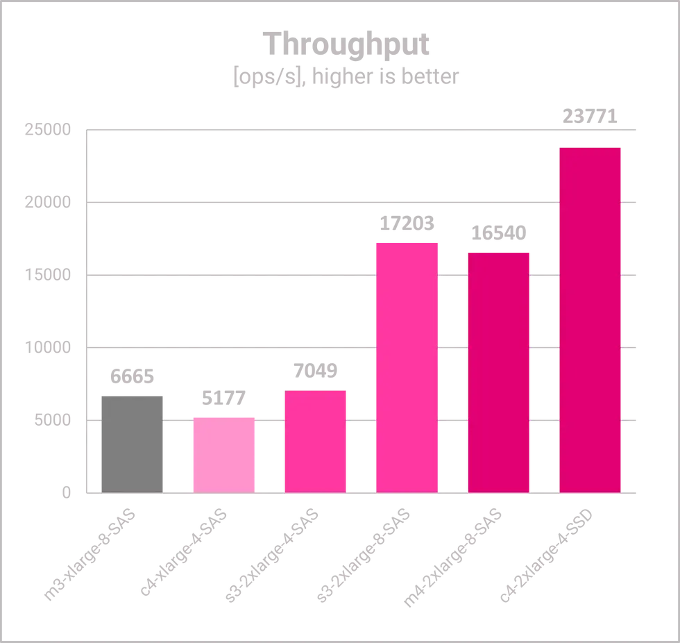 In batch 3 the VMs with the more expensive optimized resources are showing great performance with 148% higher throughput for the memory-optimized m4 and 256% higher throughput for the dedicated c4-2xlarge with ultra-high-IO.